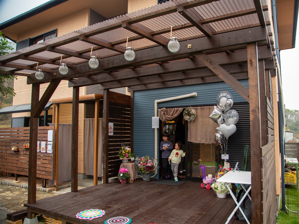店頭 テラスは家族でDIYした=坂出に米粉シフォン専門店「リトリト」