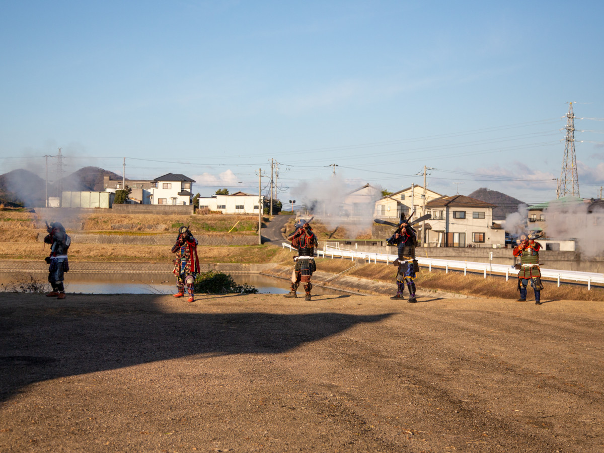 火縄銃の一斉射撃を行う「十河城鉄砲隊」メンバー 火縄銃は空砲で火薬を詰めて演武した=高松・十河の郷で甲冑姿の「戦国」初日の出