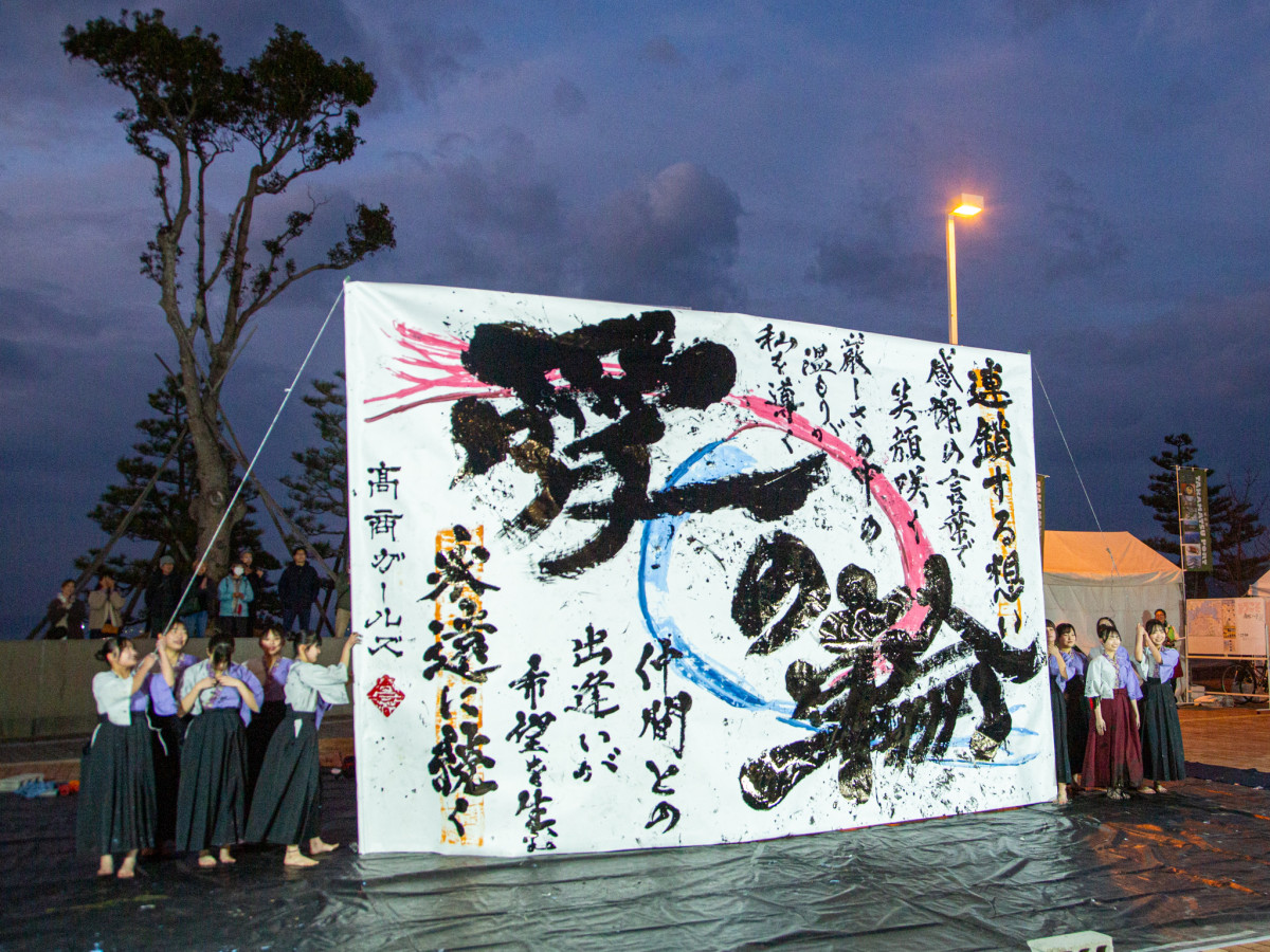 完成した作品=「飛鳥III」高松寄港 高松商「書道ガールズ」のパフォーマンスも