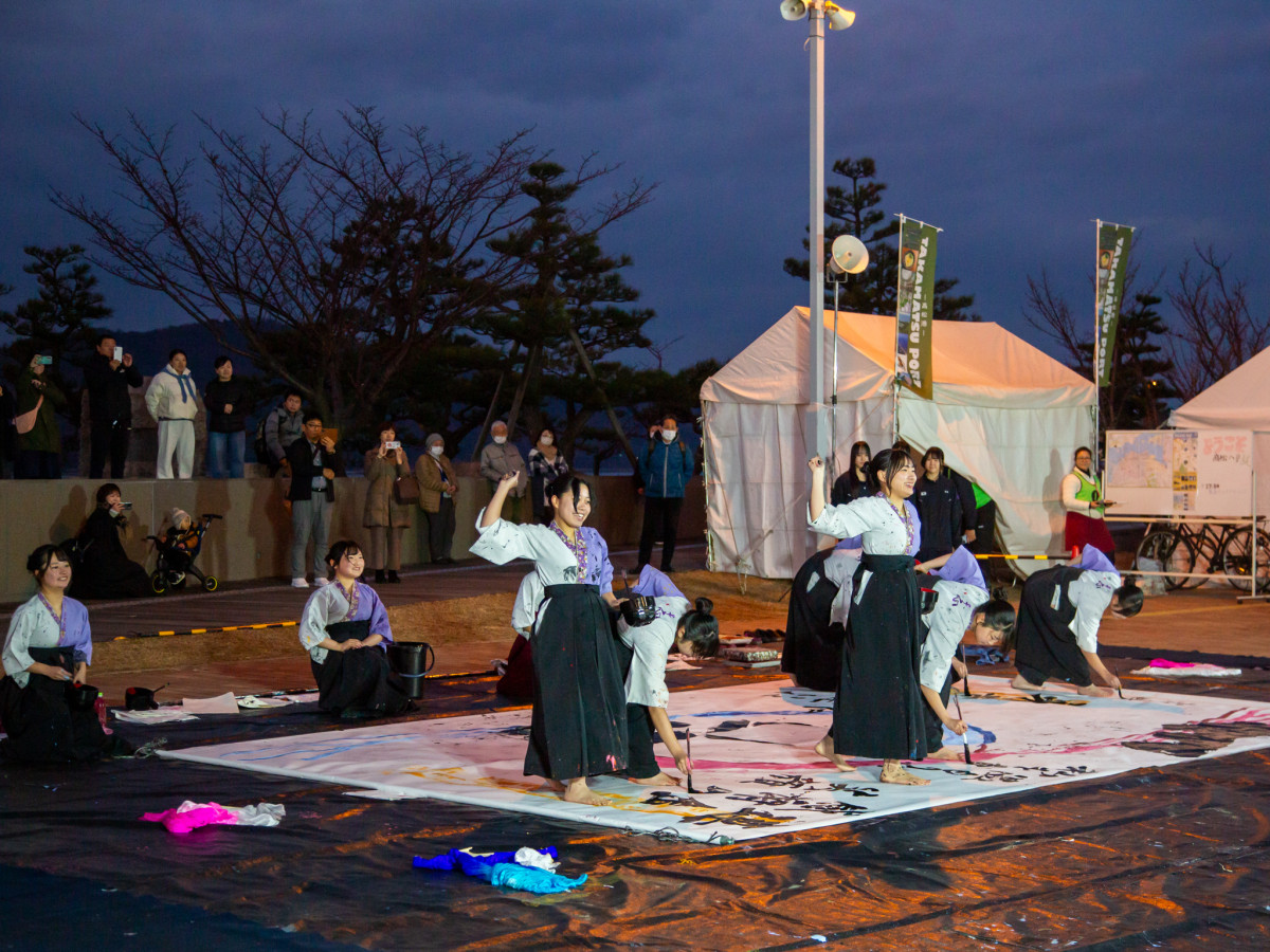 書道パフォーマンスをする高松商業高校書道部「書道ガールズ」=「飛鳥III」高松寄港 高松商「書道ガールズ」のパフォーマンスも