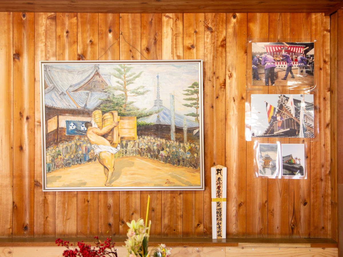 店内に掲出された「長尾寺大会陽」を伝える写真や絵=さぬき市長尾寺境内にうどん店「溜」2号店