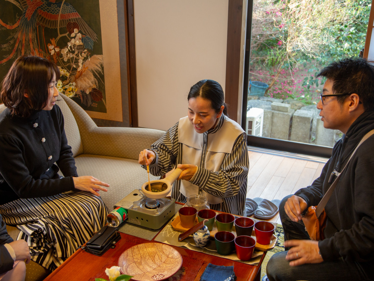 香川漆器の器にほうじ茶を淹れて楽しむ場面も=高松で香川漆芸巡る高付加価値ツアー「香川サステナブル・ツーリズム(仮称)」実験