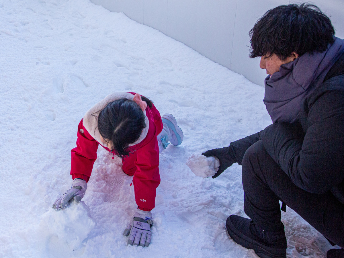 雪だるまを作る親子=高松競輪場「チータカ広場」で「高松けいりん 雪まつり~冬のワンダーランド~」