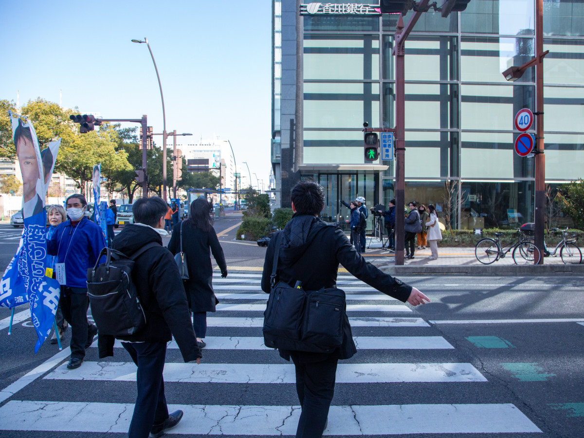 高松市中心部の中央通りと菊池寛通りが交差する「菊池寛通り(中央公園南)交差点」で1月28日、信号機を「歩車分離式」に変更する社会実験が始まった。