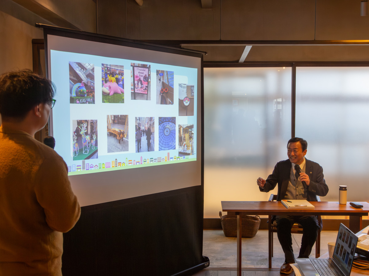参加者が撮った写真を見ながら、商店街について語る大西市長=高松で商店街歩き「タカマツ・リフレーム まち歩き」