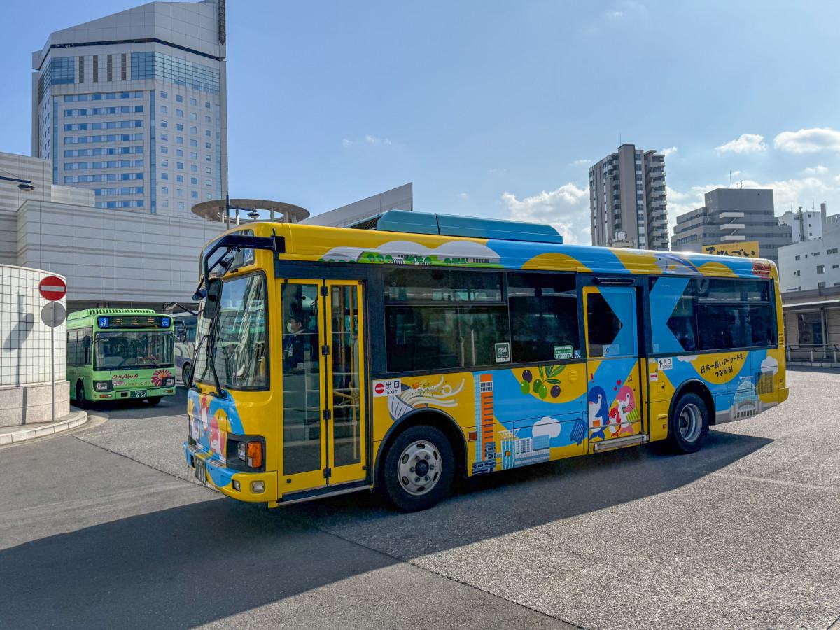 車体には「ことちゃん」ファミリーが描かれている=高松で「まちなか直行バス」社会実験