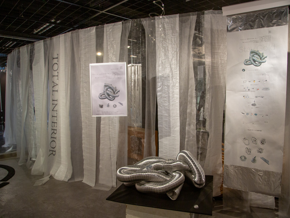不織布やビニールシートなどで飾られたトータルデザイン学科の展示スペース=高松・穴吹デザインカレッジで「デザイン展’26」
