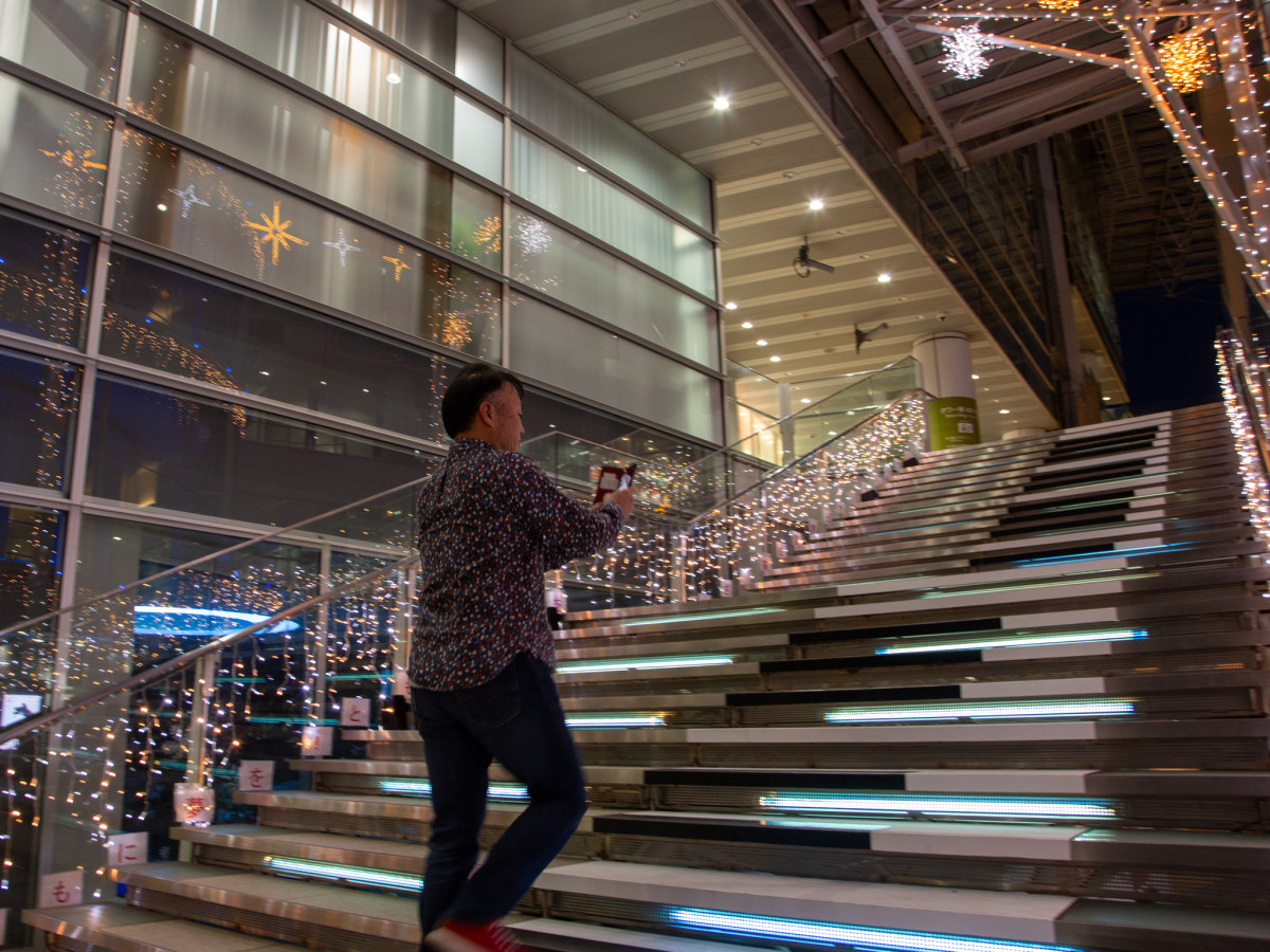 音が鳴る様子を動画に収める通行人の姿も見られた=高松シンボルタワー・デックスガレリアに「ピアノ階段」