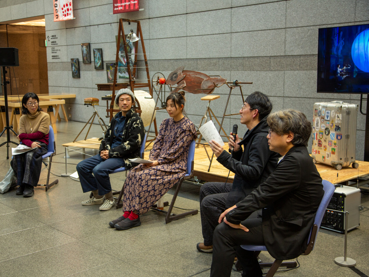3月11日に開かれたトークイベントの様子 (左から)同館学芸員の毛利直子さん、伸一さん、絵美さん、金島さん、柴田さん=高松市美術館で「ウサギニンゲン」展