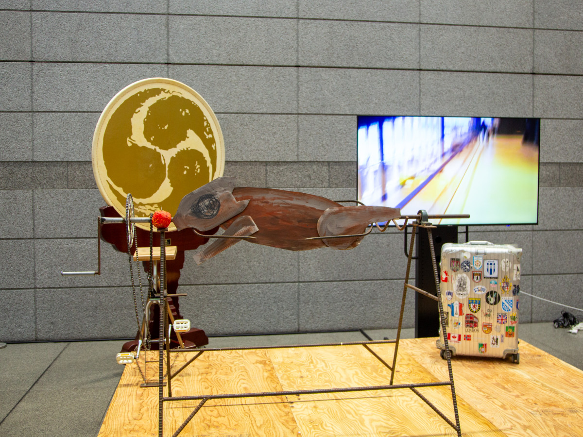 瀬戸内海の豊島を拠点とするアートユニット「usaginingen(ウサギニンゲン)」のインスタレーション展「トンビとウサギ、賑(にぎ)わいのとなりで/Beside the bustle, Sky and Earth #1」が2月10日、高松市美術館(高松市紺屋町)エントランスホールで始まった。
