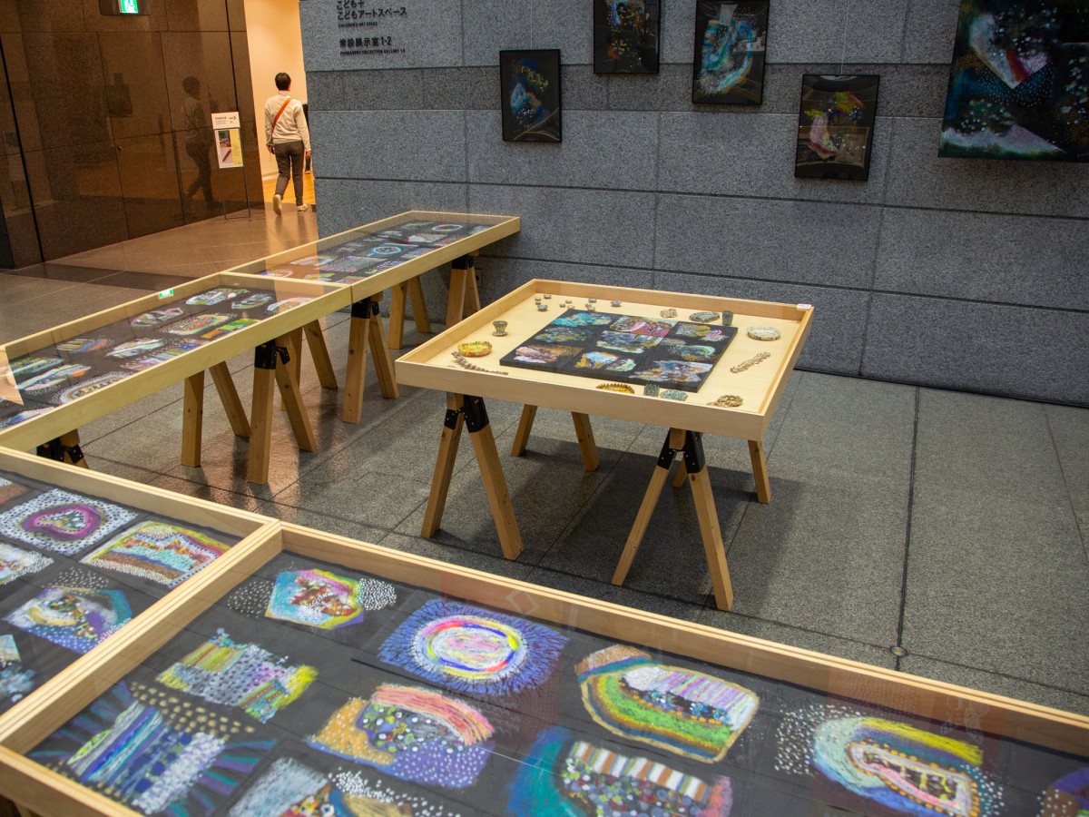 黒画用紙に絵美さんが思い思いの色や図形を描いた「見えないものが生きている」=高松市美術館で「ウサギニンゲン」展