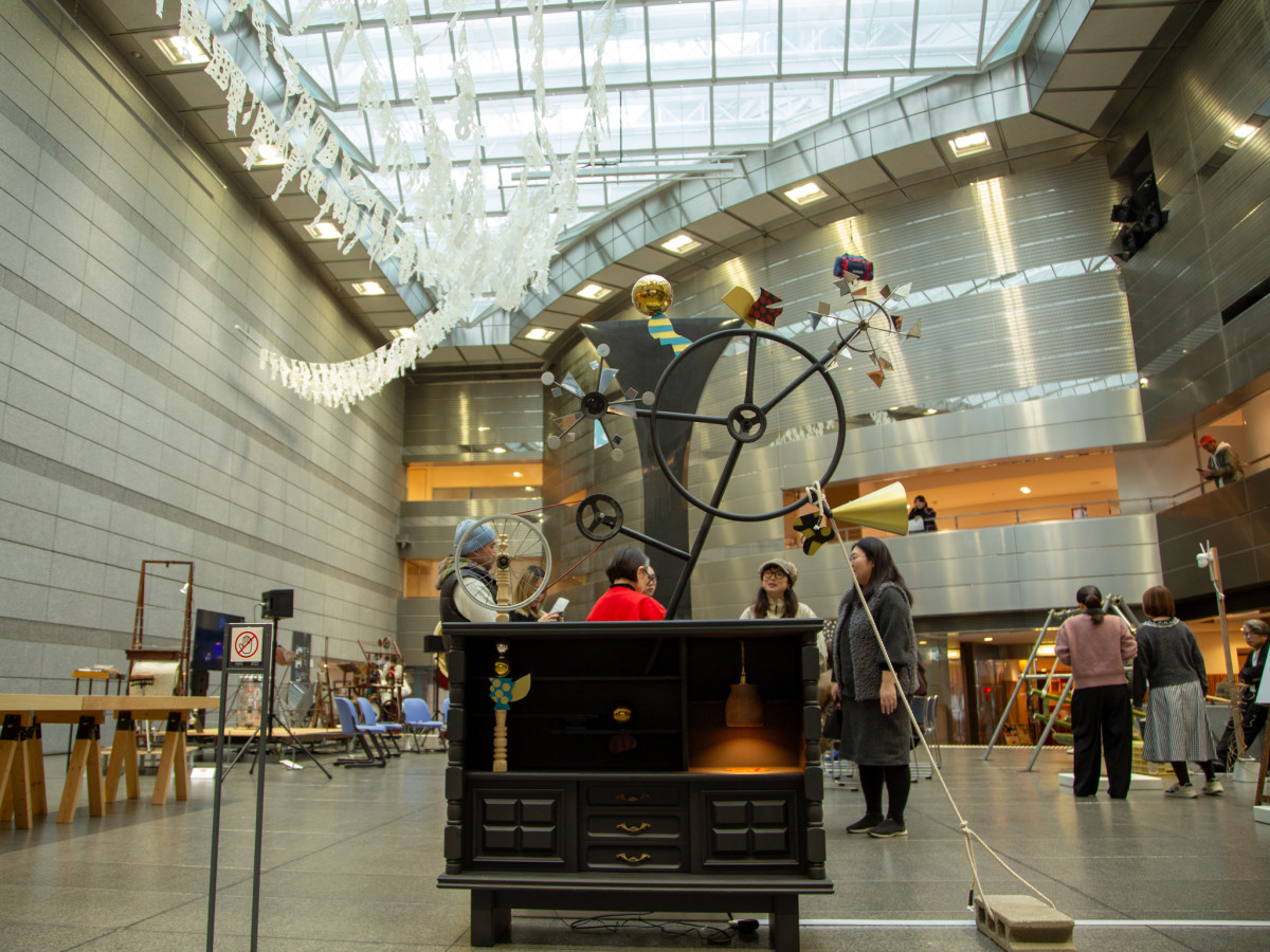 瀬戸内海の豊島を拠点とするアートユニット「usaginingen(ウサギニンゲン)」のインスタレーション展「トンビとウサギ、賑(にぎ)わいのとなりで/Beside the bustle, Sky and Earth #1」が2月10日、高松市美術館(高松市紺屋町)エントランスホールで始まった。