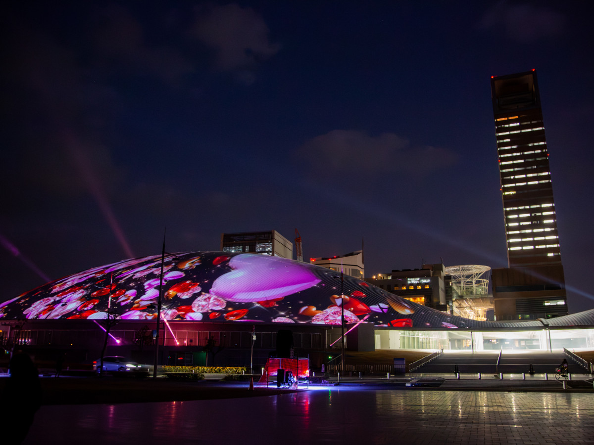高松市のあなぶきアリーナ香川(高松市サンポート)で2月13日、建物の外壁を活用したプロジェクションマッピングの投影が始まる。