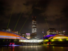 映像に加え、レーザー光線やムービングライトが夜空を彩る=香川県立アリーナでプロジェクションマッピング バレンタイン題材に