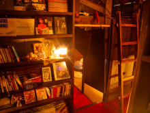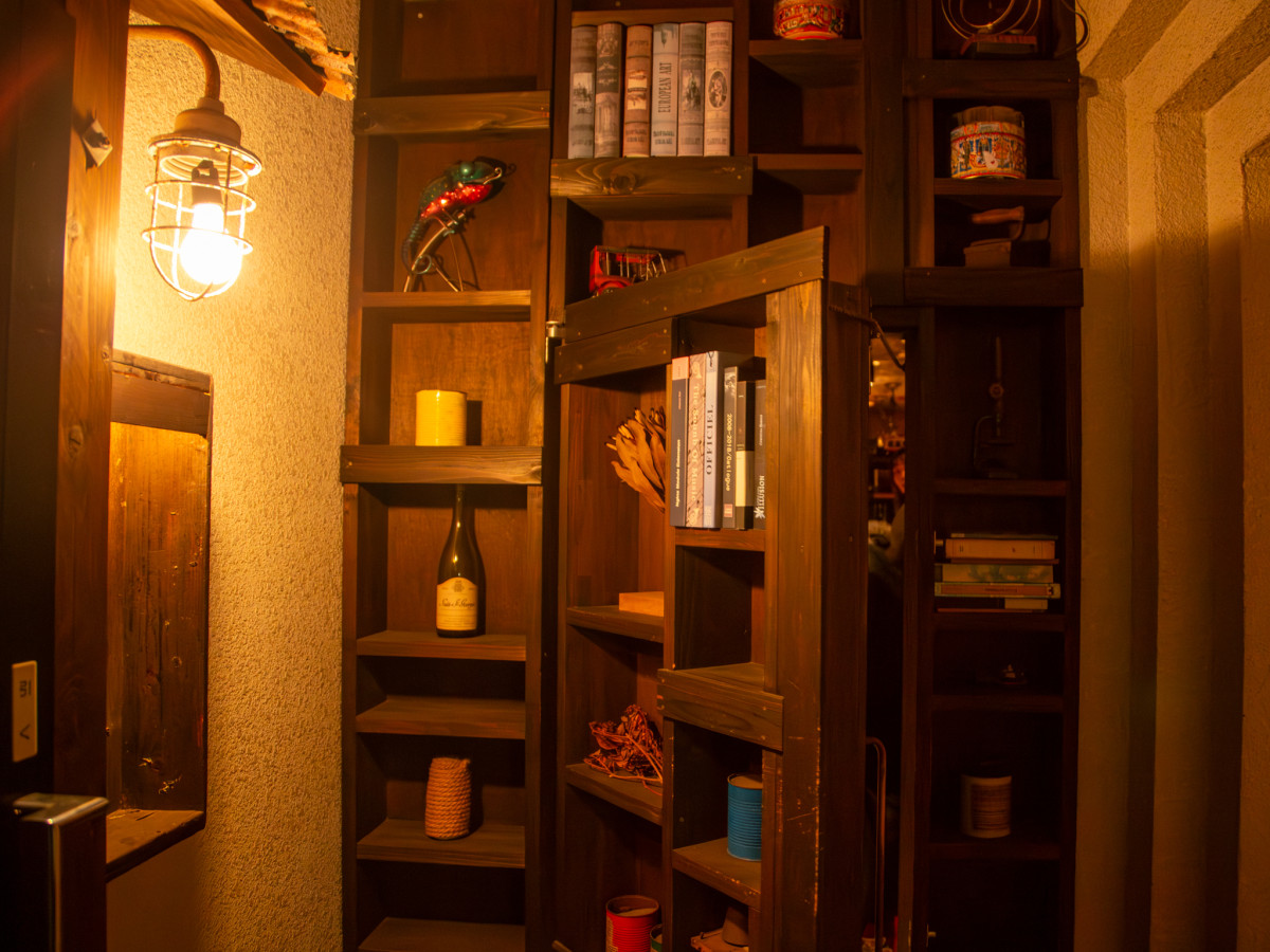 本棚に入り口が隠されている=高松の夜カフェ「世界劇場」がリニューアル