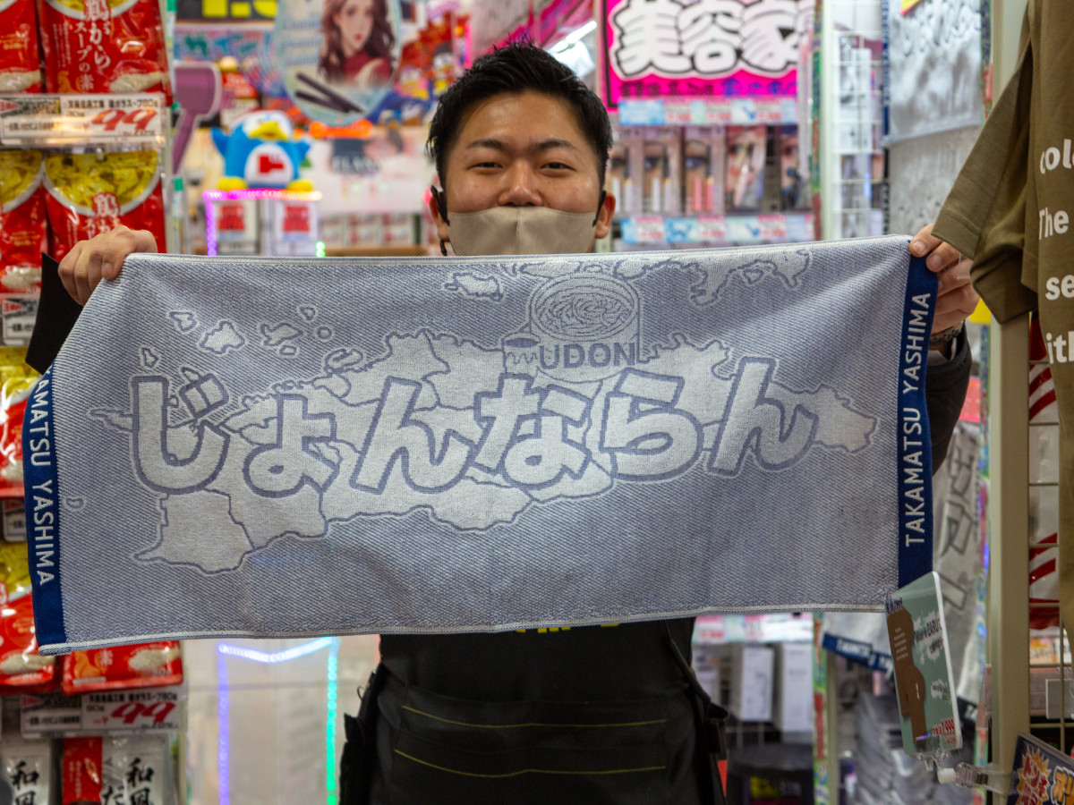 「じょんならん」とプリントされた讃岐弁タオル=高松にドン・キホーテ屋島店