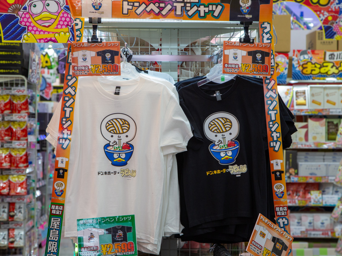 「うどん脳」と「ドンペン」のコラボTシャツ 「ドンペン」が丼になっている=高松にドン・キホーテ屋島店