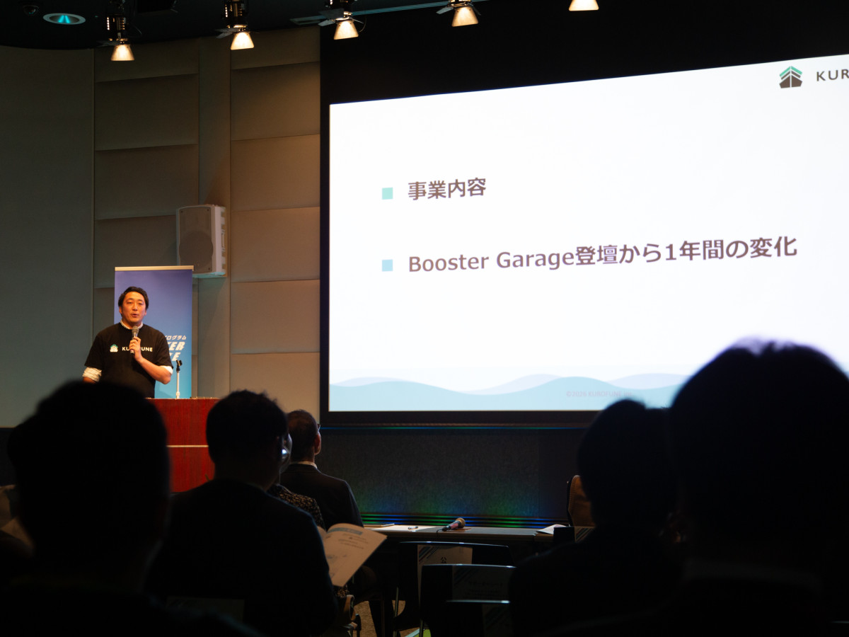 昨年の同プログラムでグランプリを獲得した「KUROFUNE」の倉片綾社長がオープニングピッチを務めた=高松で事業成長支援プログラム「Booster Garage(ブースター ガレージ)2025」最終ピッチ