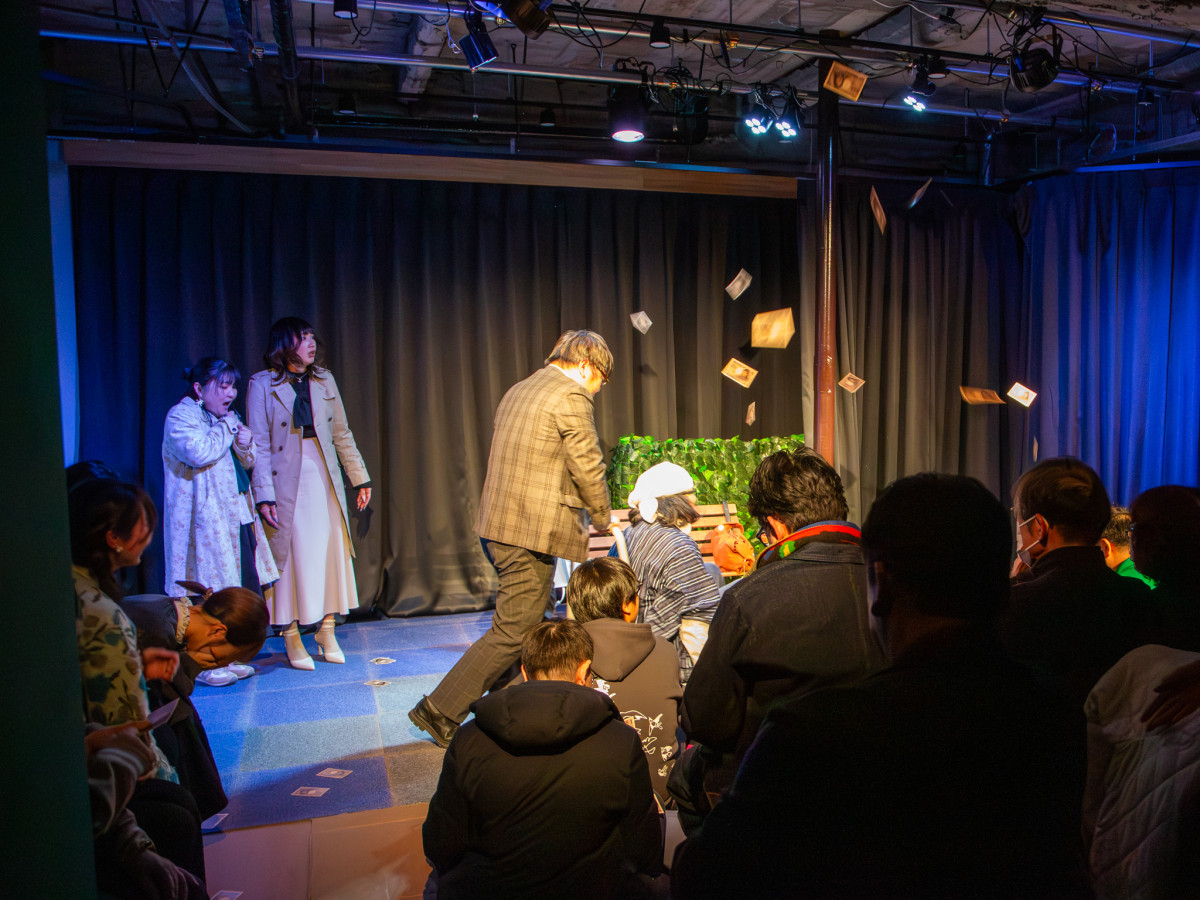 終盤は紙幣を模した札をばらまくシーンも=高松・田町に新小劇場「絵本の劇場カメレオン」