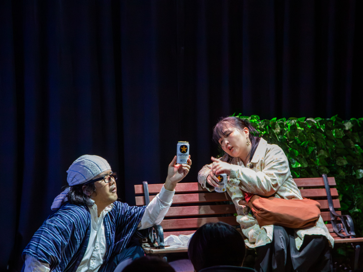 公園でカナコ(左)と「おじさん」が出会うところから物語は始まる=高松・田町に新小劇場「絵本の劇場カメレオン」