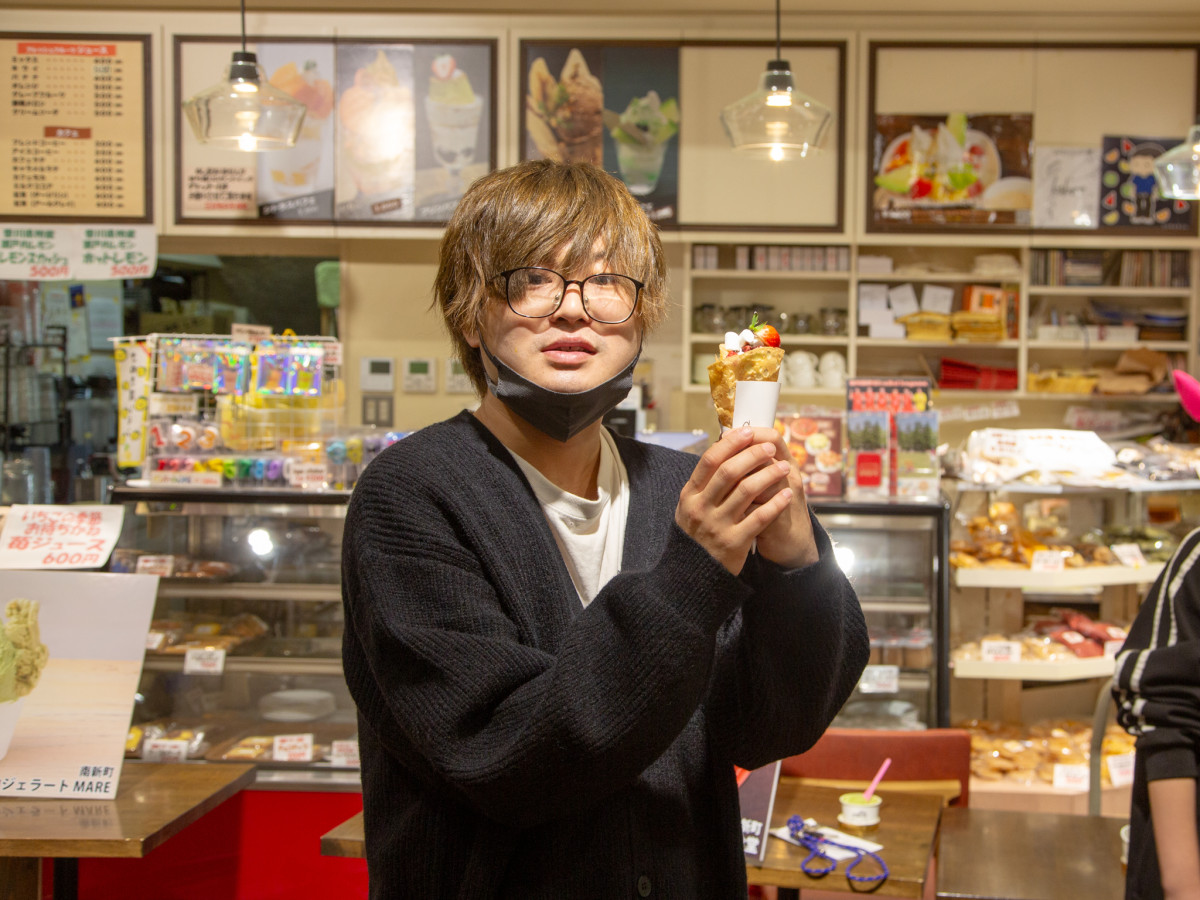クレープを手にする「古墳シスターズ」ベースの小幡隆志さん=「SANUKI ROCK COLOSSEUM」に合わせ高松の商店街が限定企画