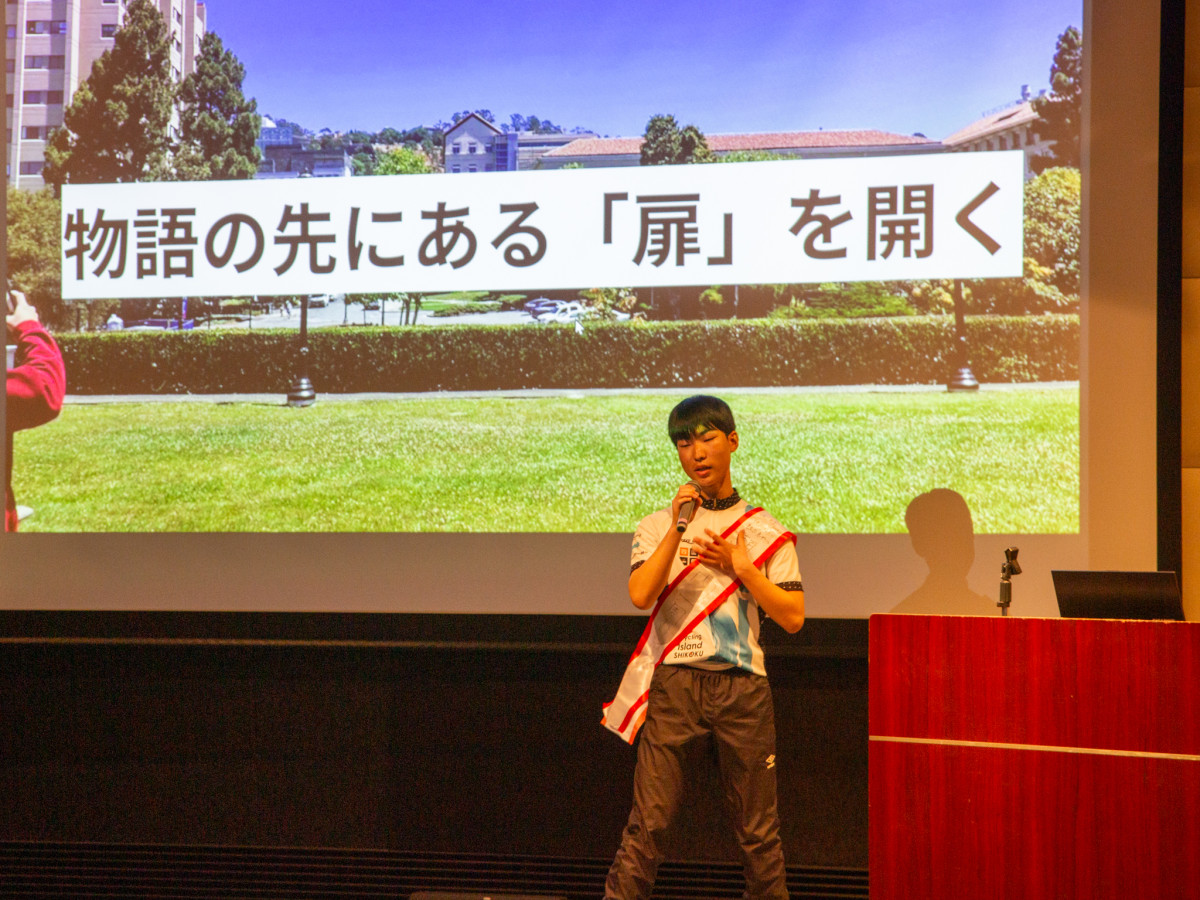「サニー留学」2期生として登壇した山下さん 岡山在住で自転車で4日間かけて香川に来た=サンポート高松・BBスクエアで「サニピッチ2026」