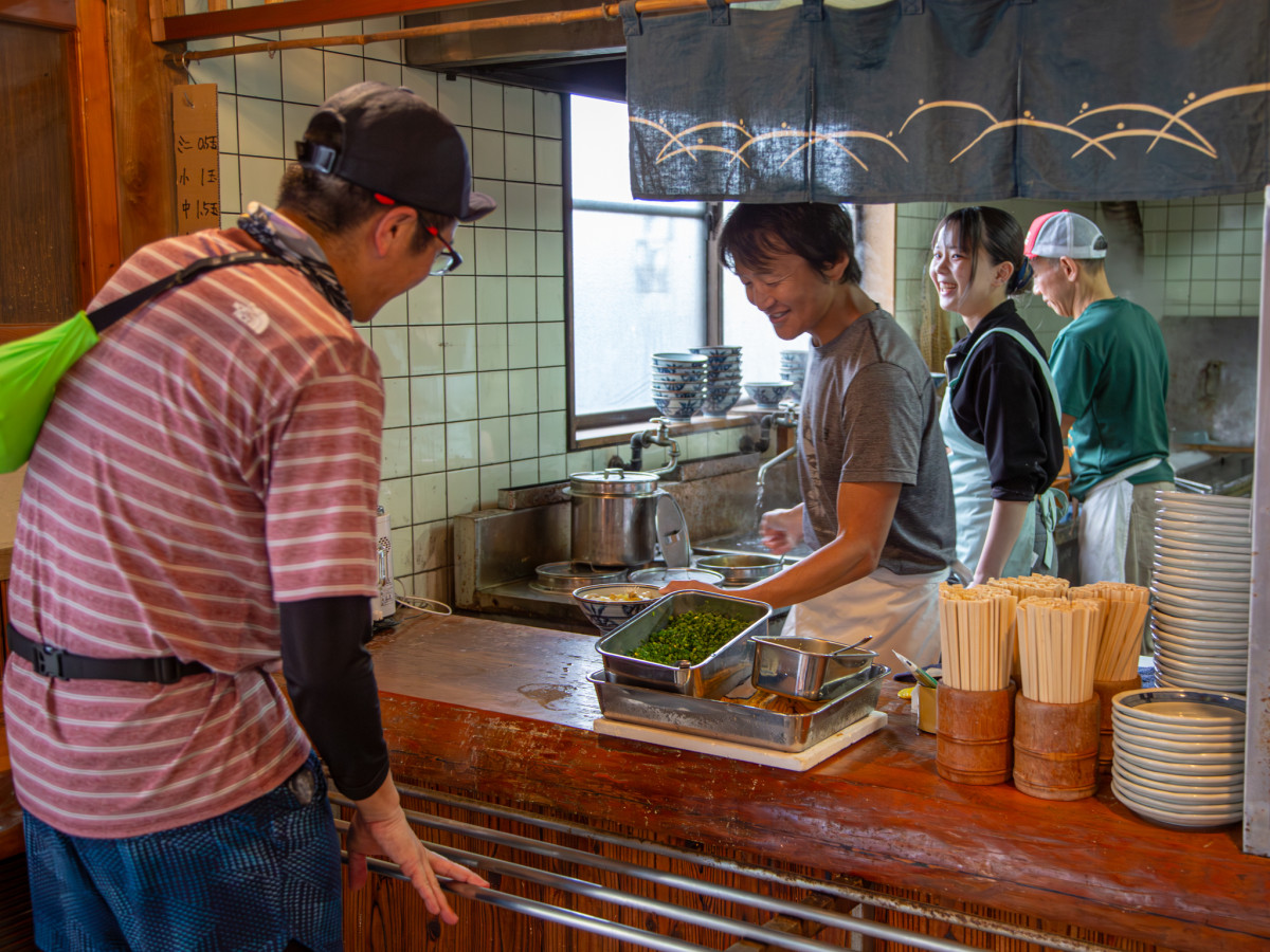 「上野製麺所」でうどんを振る舞ういいのさん=高松で「ウルトラうどんマラニック(UUM)」