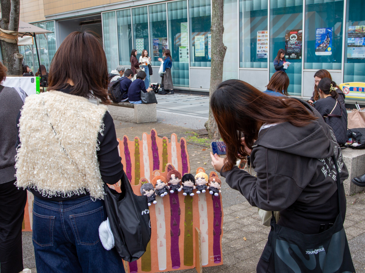 隣接のあなぶきアリーナ香川でコンサートを開いていた音楽グループ「SixTONES」のファンの姿も見られた アスパラのオブジェとぬいぐるみキーホルダーの写真を撮るファン=サンポート高松で「アスパラ大騒ぎ」