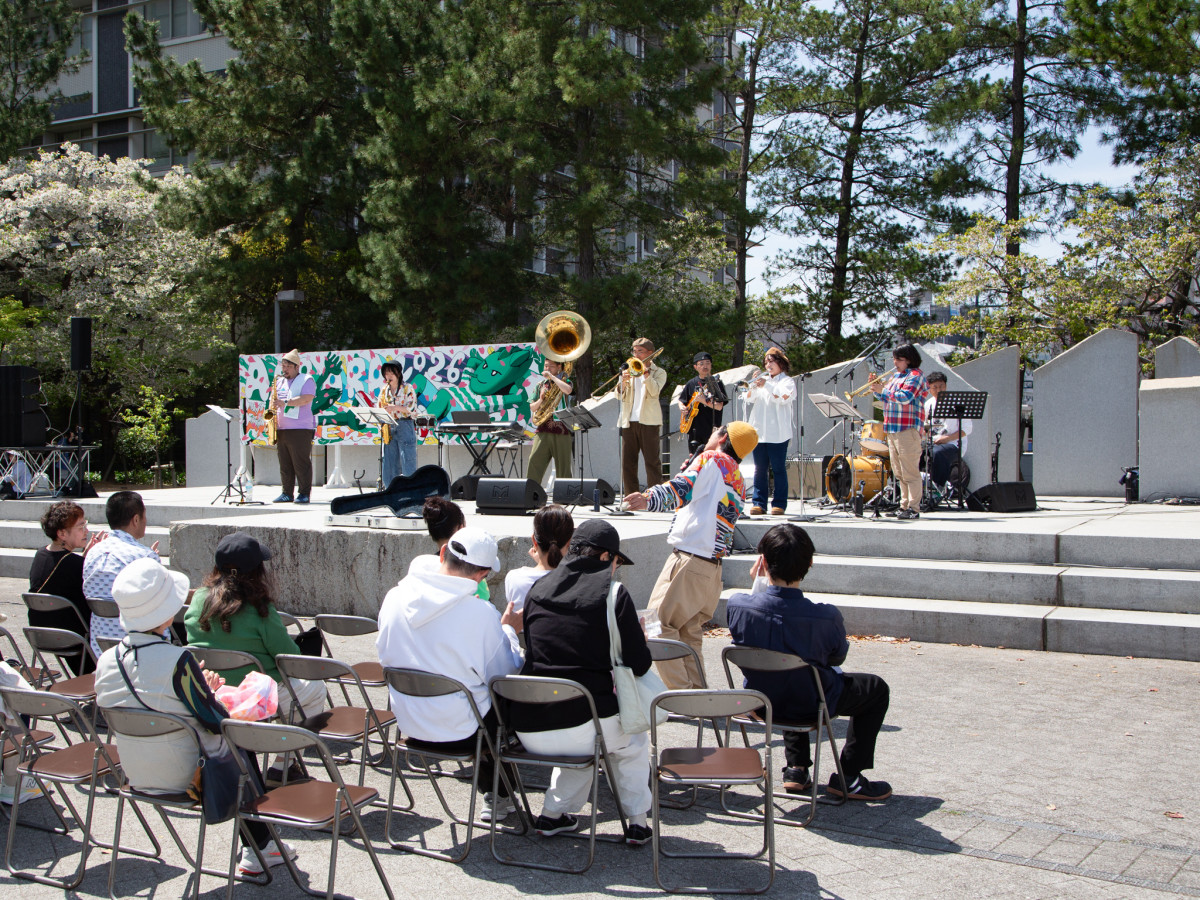 イベントのオープニングで演奏した「スルリコスブラスバンド」=サンポート高松で「アスパラ大騒ぎ」
