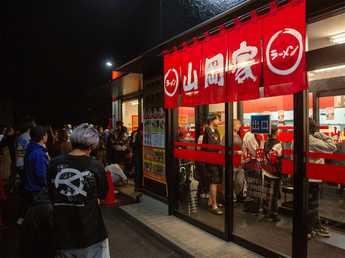 深夜でも行列は途絶えない(4月19日2時32分撮影)=高松に24時間営業「ラーメン山岡家 高松中央インター店」