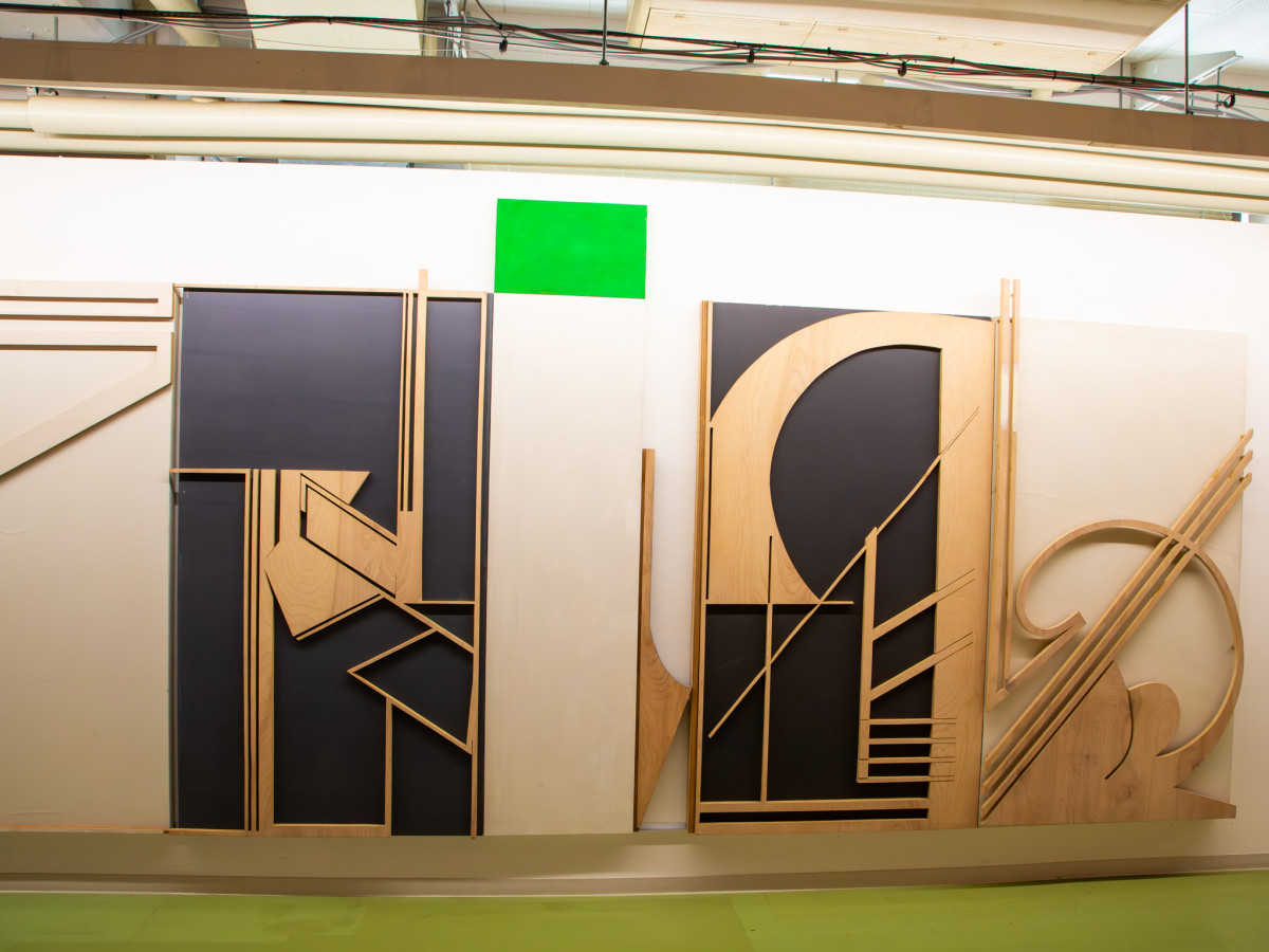 さまざまなパターンの木材を組み合わせた作品=高松・川島猛アートファクトリーで企画展「川島猛 60年の軌跡 挑戦-見果てぬ夢を追う旅へ Part1」