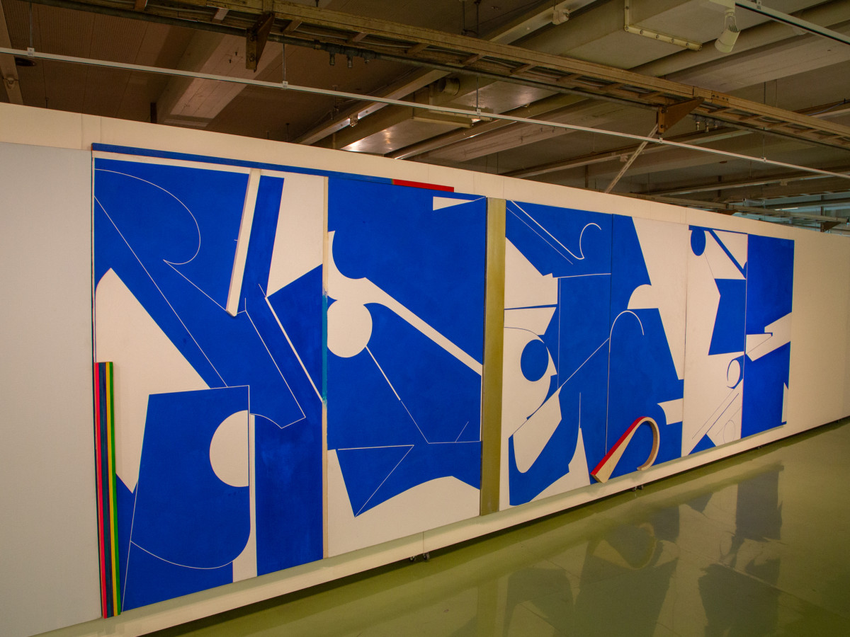 青色に塗られた大型作品 青は均一に塗られておらず色むらなどの変化が見られる=高松・川島猛アートファクトリーで企画展「川島猛 60年の軌跡 挑戦-見果てぬ夢を追う旅へ Part1」
