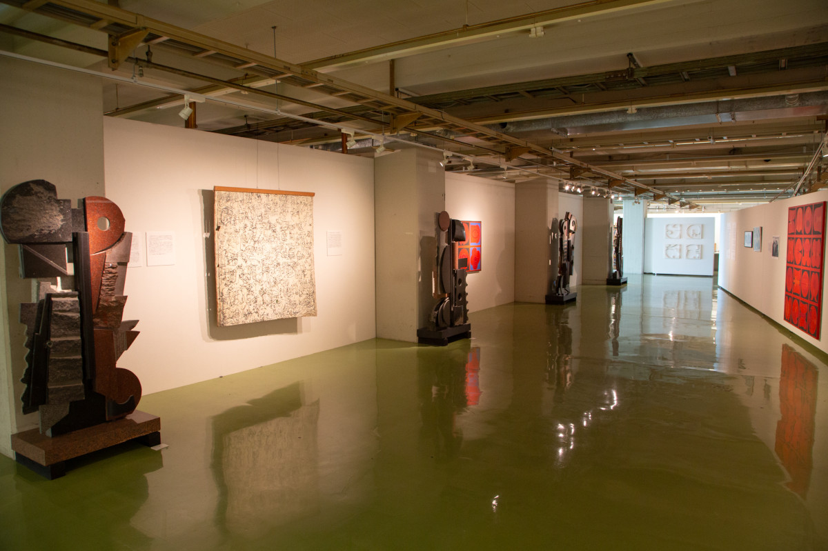 川島さんの彫刻作品も並ぶ=高松・川島猛アートファクトリーで企画展「川島猛 60年の軌跡 挑戦-見果てぬ夢を追う旅へ Part1」