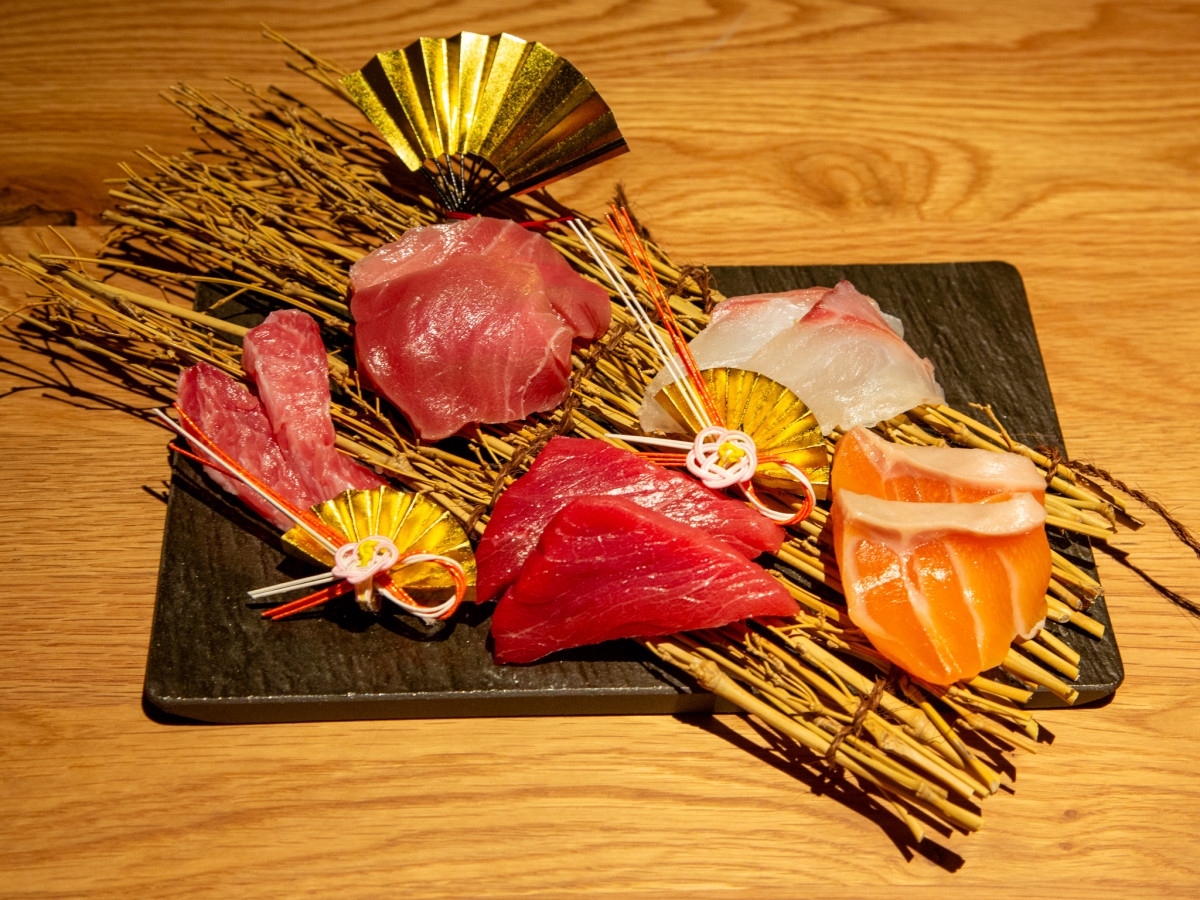 「魚焼肉」5種盛り サーモンやタイ、マグロの頬肉や中トロなどが並ぶ=高松・フェリー通りに「魚焼肉と旬の海鮮居酒屋 出世魚」