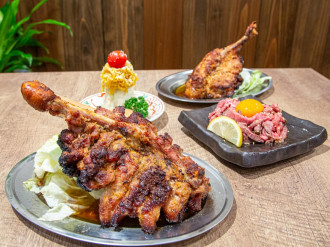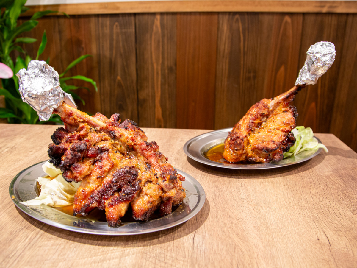 同店の「骨付鳥」 左が「種鶏の親」=高松・ライオン通りに「骨付鳥一本がぶ丸」