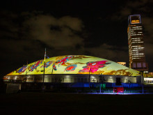 高松市のあなぶきアリーナ香川(高松市サンポート)で10月29日、アリーナ壁面を活用したプロジェクションマッピングの投影が始まる。
