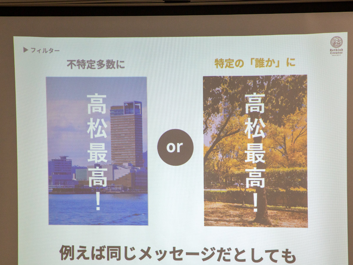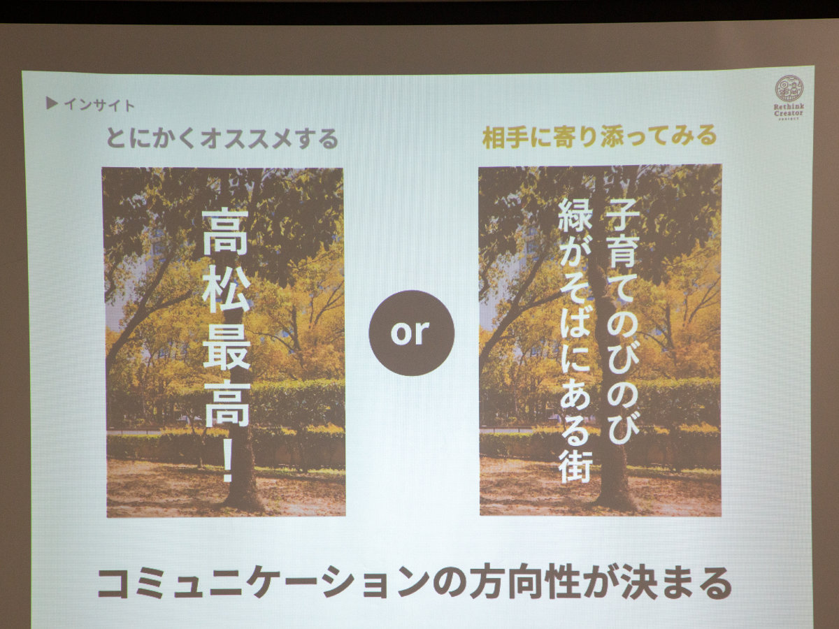 「日本中でクリエイターの地産地消を~地元を誰かにまかせない~」をテーマに、それぞれの「地域」、「文化」、「暮らし」ならではの魅力を地元の人が発見・発信していくことで、持続可能な地域活性化の一助となることを目指している「Rethink Creator PROJECT(リシンククリエイタープロジェクト)」。その一環である「Rethinkセミナー」が5月25日、高松市民防災センター(高松市多肥下町)で開かれました。