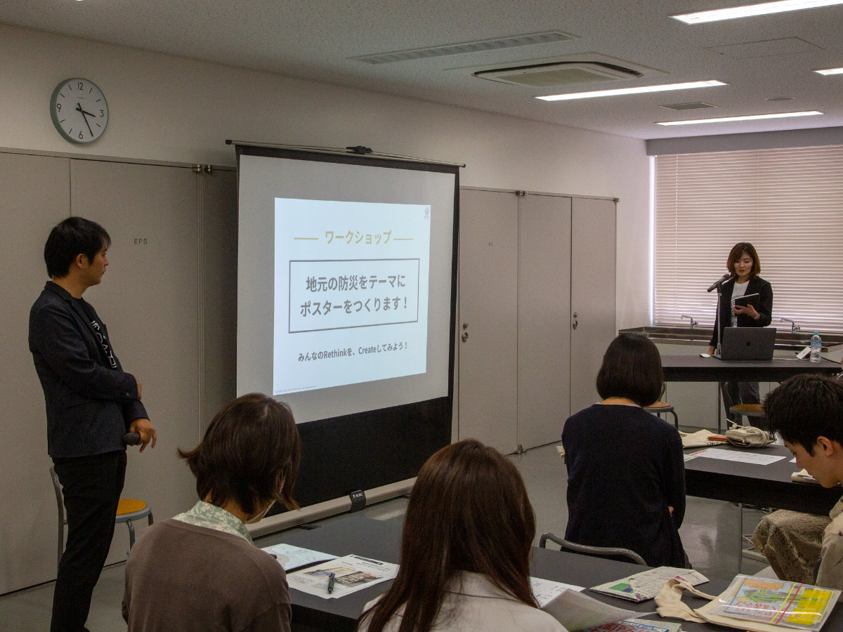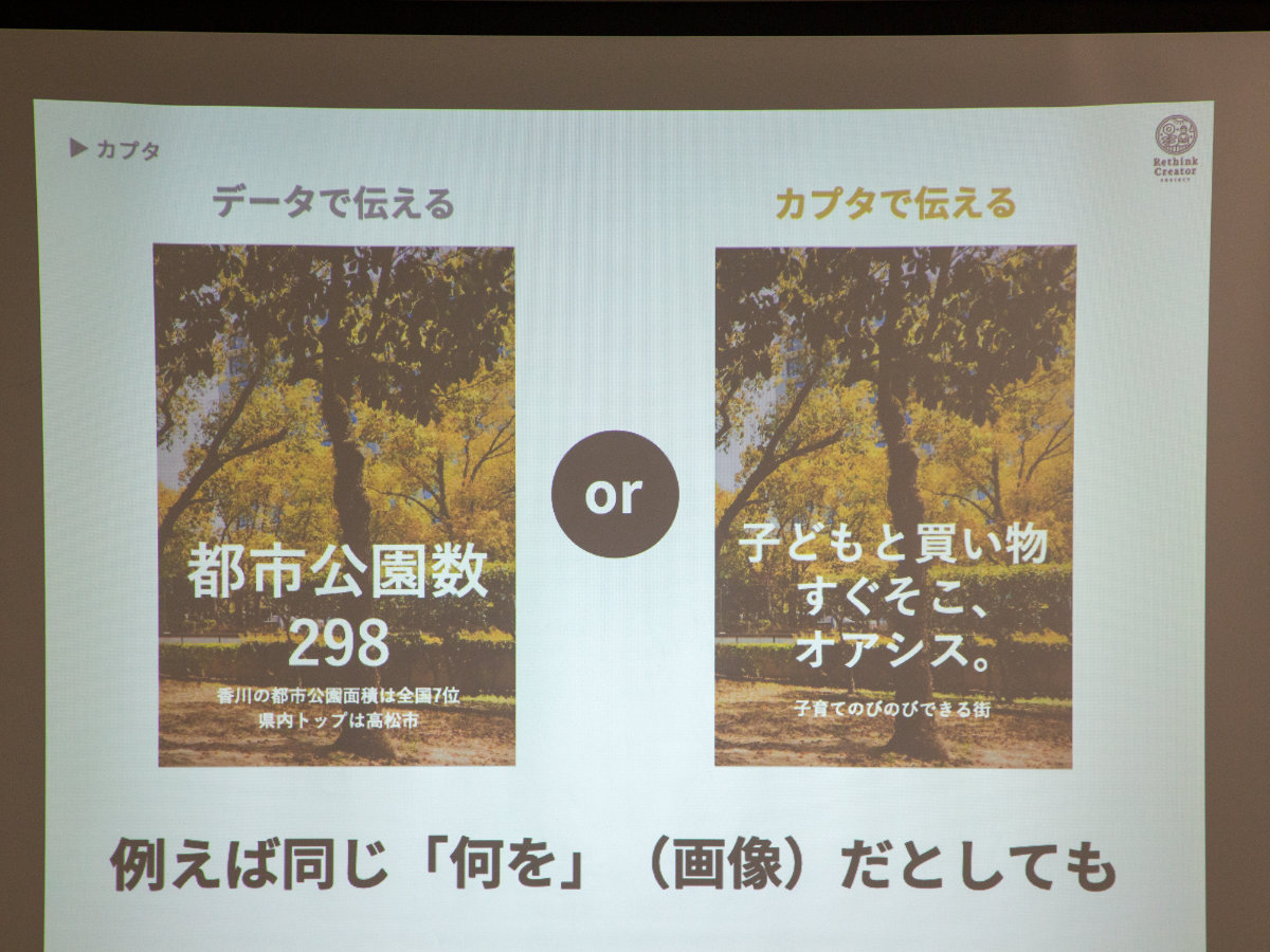 セミナーは前半30分・後半90分の合計120分で構成され、前半では「Rethink=視点を変えて考える」講座を受け、後半ではその技術を駆使しながら地元のPRポスター2点を実際に製作していきます。講師はライターの大鹿一也さんと、デザイナーの磯田浩見さん。香川県在住の講師2人がトークを交えながらわかりやすく「Rethink(視点を変える)」のコツを手ほどきしていきます。