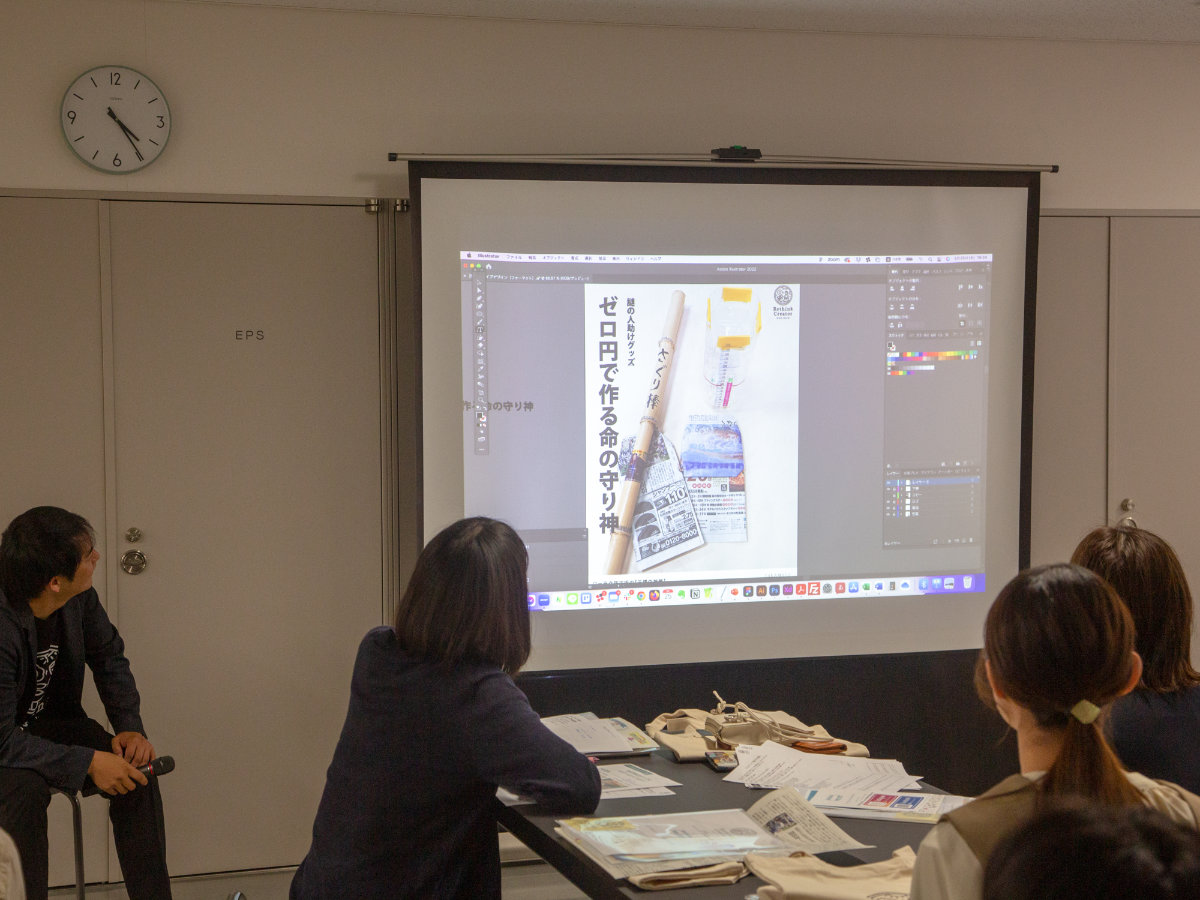 ペットボトルを使った降水量観測装置「アメミルペット」や浸水で足元が見えない時に安全を確認する竹を使った「さぐり棒」など、身近なものからできる防災グッズを紹介する中村さん。講義の中ではガラスなど尖ったものが散乱する地面も安全に歩ける新聞紙で折れるスリッパを作りました。